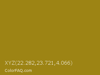 XYZ 22.282,23.721,4.066 Color is a normal yellow color and the nearest color is Reef Gold #9f821c. Hex code #9d8414 and RGB value is rgb(157,132,20). In RGB color space, this color is composed of 62% red, 52% green, 8% blue, In CMYK color space, this color is composed of 0% cyan, 16% magenta, 87% yellow , 38% black , In HSL color space, this color has a hue angle of 49° , 77% saturation and 35% lightness.