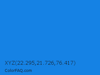 XYZ 22.295,21.726,76.417 Color is a normal blue color and the nearest color is Bright Navy Blue #1974d2. Hex code #1582e4 and RGB value is rgb(21,130,228). In RGB color space, this color is composed of 8% red, 51% green, 89% blue, In CMYK color space, this color is composed of 91% cyan, 43% magenta, 0% yellow , 11% black , In HSL color space, this color has a hue angle of 208° , 83% saturation and 49% lightness.