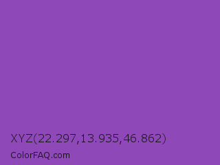 XYZ 22.297,13.935,46.862 Color is a normal purple color and the nearest color is Purple Plum #9c51b6. Hex code #8f48b8 and RGB value is rgb(143,72,184). In RGB color space, this color is composed of 56% red, 28% green, 72% blue, In CMYK color space, this color is composed of 22% cyan, 61% magenta, 0% yellow , 28% black , In HSL color space, this color has a hue angle of 278° , 44% saturation and 50% lightness.