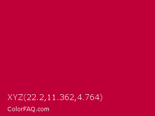 XYZ 22.2,11.362,4.764 Color is a normal rose color and the nearest color is Crimson Glory #be0032. Hex code #bf0038 and RGB value is rgb(191,0,56). In RGB color space, this color is composed of 75% red, 0% green, 22% blue, In CMYK color space, this color is composed of 0% cyan, 100% magenta, 71% yellow , 25% black , In HSL color space, this color has a hue angle of 342° , 100% saturation and 37% lightness.