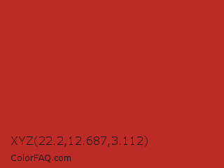 XYZ 22.2,12.687,3.112 Color is a normal red color and the nearest color is Tall Poppy #b32d29. Hex code #bd2b26 and RGB value is rgb(189,43,38). In RGB color space, this color is composed of 74% red, 17% green, 15% blue, In CMYK color space, this color is composed of 0% cyan, 77% magenta, 80% yellow , 26% black , In HSL color space, this color has a hue angle of 2° , 67% saturation and 45% lightness.