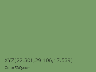 XYZ 22.301,29.106,17.539 Color is a normal green color and the nearest color is Asparagus Green #7ba05b. Hex code #789d68 and RGB value is rgb(120,157,104). In RGB color space, this color is composed of 47% red, 62% green, 41% blue, In CMYK color space, this color is composed of 24% cyan, 0% magenta, 34% yellow , 38% black , In HSL color space, this color has a hue angle of 102° , 21% saturation and 51% lightness.