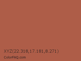 XYZ 22.318,17.181,8.271 Color is a normal red color and the nearest color is Giants Club #b05c52. Hex code #ad5d48 and RGB value is rgb(173,93,72). In RGB color space, this color is composed of 68% red, 36% green, 28% blue, In CMYK color space, this color is composed of 0% cyan, 46% magenta, 58% yellow , 32% black , In HSL color space, this color has a hue angle of 12° , 41% saturation and 48% lightness.