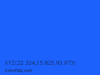 XYZ 22.324,15.825,93.973 Color is a normal blue color and the nearest color is Blue Crayola #1f75fe. Hex code #1c61fc and RGB value is rgb(28,97,252). In RGB color space, this color is composed of 11% red, 38% green, 99% blue, In CMYK color space, this color is composed of 89% cyan, 62% magenta, 0% yellow , 1% black , In HSL color space, this color has a hue angle of 222° , 97% saturation and 55% lightness.