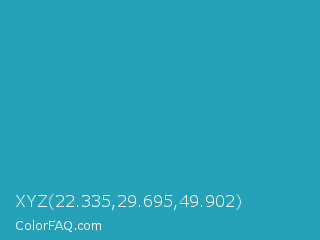 XYZ 22.335,29.695,49.902 Color is a normal cyan color and the nearest color is Eastern Blue #1e9ab0. Hex code #25a2b8 and RGB value is rgb(37,162,184). In RGB color space, this color is composed of 15% red, 64% green, 72% blue, In CMYK color space, this color is composed of 80% cyan, 12% magenta, 0% yellow , 28% black , In HSL color space, this color has a hue angle of 189° , 67% saturation and 43% lightness.