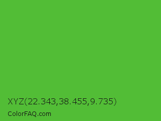 XYZ 22.343,38.455,9.735 Color is a normal green color and the nearest color is Apple #4fa83d. Hex code #52bd36 and RGB value is rgb(82,189,54). In RGB color space, this color is composed of 32% red, 74% green, 21% blue, In CMYK color space, this color is composed of 57% cyan, 0% magenta, 71% yellow , 26% black , In HSL color space, this color has a hue angle of 108° , 56% saturation and 48% lightness.