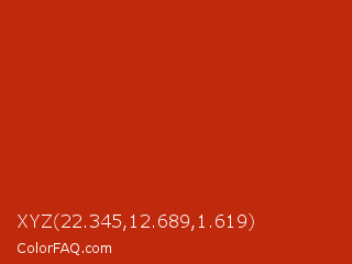XYZ 22.345,12.689,1.619 Color is a normal red color and the nearest color is Thunderbird #c02b18. Hex code #bf290c and RGB value is rgb(191,41,12). In RGB color space, this color is composed of 75% red, 16% green, 5% blue, In CMYK color space, this color is composed of 0% cyan, 79% magenta, 94% yellow , 25% black , In HSL color space, this color has a hue angle of 10° , 88% saturation and 40% lightness.