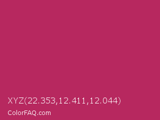 XYZ 22.353,12.411,12.044 Color is a normal rose color and the nearest color is Rich Maroon #b03060. Hex code #b7285f and RGB value is rgb(183,40,95). In RGB color space, this color is composed of 72% red, 16% green, 37% blue, In CMYK color space, this color is composed of 0% cyan, 78% magenta, 48% yellow , 28% black , In HSL color space, this color has a hue angle of 337° , 64% saturation and 44% lightness.