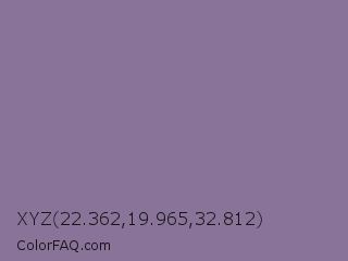 XYZ 22.362,19.965,32.812 Color is a normal purple color and the nearest color is Trendy Pink #8c6495. Hex code #8a7399 and RGB value is rgb(138,115,153). In RGB color space, this color is composed of 54% red, 45% green, 60% blue, In CMYK color space, this color is composed of 10% cyan, 25% magenta, 0% yellow , 40% black , In HSL color space, this color has a hue angle of 276° , 16% saturation and 53% lightness.
