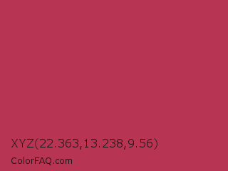 XYZ 22.363,13.238,9.56 Color is a normal red color and the nearest color is Dingy Dungeon #c53151. Hex code #b73553 and RGB value is rgb(183,53,83). In RGB color space, this color is composed of 72% red, 21% green, 33% blue, In CMYK color space, this color is composed of 0% cyan, 71% magenta, 55% yellow , 28% black , In HSL color space, this color has a hue angle of 346° , 55% saturation and 46% lightness.