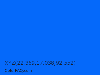 XYZ 22.369,17.038,92.552 Color is a normal blue color and the nearest color is Blue Ribbon #0066ff. Hex code #0569fa and RGB value is rgb(5,105,250). In RGB color space, this color is composed of 2% red, 41% green, 98% blue, In CMYK color space, this color is composed of 98% cyan, 58% magenta, 0% yellow , 2% black , In HSL color space, this color has a hue angle of 216° , 96% saturation and 50% lightness.