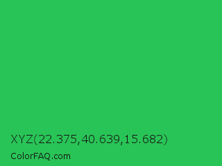 XYZ 22.375,40.639,15.682 Color is a normal green color and the nearest color is UFO Green #3cd070. Hex code #29c457 and RGB value is rgb(41,196,87). In RGB color space, this color is composed of 16% red, 77% green, 34% blue, In CMYK color space, this color is composed of 79% cyan, 0% magenta, 56% yellow , 23% black , In HSL color space, this color has a hue angle of 138° , 65% saturation and 46% lightness.