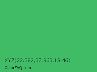 XYZ 22.382,37.963,18.46 Color is a normal green color and the nearest color is Medium Sea Green #3cb371. Hex code #3fbc65 and RGB value is rgb(63,188,101). In RGB color space, this color is composed of 25% red, 74% green, 40% blue, In CMYK color space, this color is composed of 66% cyan, 0% magenta, 46% yellow , 26% black , In HSL color space, this color has a hue angle of 138° , 50% saturation and 49% lightness.