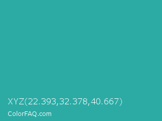XYZ 22.393,32.378,40.667 Color is a normal cyan color and the nearest color is Light Sea Green #20b2aa. Hex code #2caba5 and RGB value is rgb(44,171,165). In RGB color space, this color is composed of 17% red, 67% green, 65% blue, In CMYK color space, this color is composed of 74% cyan, 0% magenta, 4% yellow , 33% black , In HSL color space, this color has a hue angle of 177° , 59% saturation and 42% lightness.