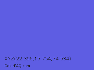 XYZ 22.396,15.754,74.534 Color is a light blue color and the nearest color is Majorelle Blue #6050dc. Hex code #5e5de3 and RGB value is rgb(94,93,227). In RGB color space, this color is composed of 37% red, 36% green, 89% blue, In CMYK color space, this color is composed of 59% cyan, 59% magenta, 0% yellow , 11% black , In HSL color space, this color has a hue angle of 240° , 71% saturation and 63% lightness.