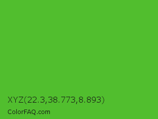 XYZ 22.3,38.773,8.893 Color is a normal green color and the nearest color is Kelly Green #4cbb17. Hex code #51be2e and RGB value is rgb(81,190,46). In RGB color space, this color is composed of 32% red, 75% green, 18% blue, In CMYK color space, this color is composed of 57% cyan, 0% magenta, 76% yellow , 25% black , In HSL color space, this color has a hue angle of 105° , 61% saturation and 46% lightness.
