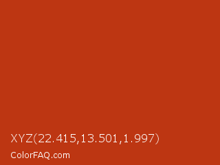 XYZ 22.415,13.501,1.997 Color is a normal red color and the nearest color is Thunderbird #c02b18. Hex code #bd3612 and RGB value is rgb(189,54,18). In RGB color space, this color is composed of 74% red, 21% green, 7% blue, In CMYK color space, this color is composed of 0% cyan, 71% magenta, 90% yellow , 26% black , In HSL color space, this color has a hue angle of 13° , 83% saturation and 41% lightness.