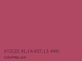 XYZ 22.41,14.637,13.449 Color is a normal rose color and the nearest color is Hippie Pink #ae4560. Hex code #b04763 and RGB value is rgb(176,71,99). In RGB color space, this color is composed of 69% red, 28% green, 39% blue, In CMYK color space, this color is composed of 0% cyan, 60% magenta, 44% yellow , 31% black , In HSL color space, this color has a hue angle of 344° , 43% saturation and 48% lightness.