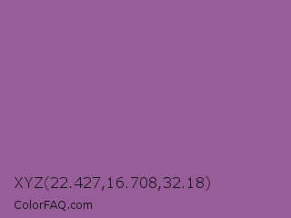 XYZ 22.427,16.708,32.18 Color is a normal magenta color and the nearest color is Trendy Pink #8c6495. Hex code #975d99 and RGB value is rgb(151,93,153). In RGB color space, this color is composed of 59% red, 36% green, 60% blue, In CMYK color space, this color is composed of 1% cyan, 39% magenta, 0% yellow , 40% black , In HSL color space, this color has a hue angle of 298° , 24% saturation and 48% lightness.