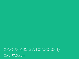 XYZ 22.435,37.102,30.024 Color is a normal green color and the nearest color is Mountain Meadow Crayola #1ab385. Hex code #14ba8a and RGB value is rgb(20,186,138). In RGB color space, this color is composed of 8% red, 73% green, 54% blue, In CMYK color space, this color is composed of 89% cyan, 0% magenta, 26% yellow , 27% black , In HSL color space, this color has a hue angle of 163° , 81% saturation and 40% lightness.