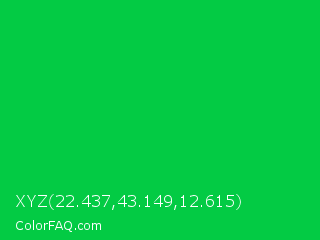 XYZ 22.437,43.149,12.615 Color is a normal green color and the nearest color is Dark Pastel Green #03c03c. Hex code #03cb44 and RGB value is rgb(3,203,68). In RGB color space, this color is composed of 1% red, 80% green, 27% blue, In CMYK color space, this color is composed of 99% cyan, 0% magenta, 67% yellow , 20% black , In HSL color space, this color has a hue angle of 140° , 97% saturation and 40% lightness.
