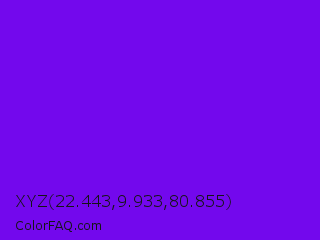 XYZ 22.443,9.933,80.855 Color is a normal violet color and the nearest color is Electric Indigo #6f00ff. Hex code #7308ed and RGB value is rgb(115,8,237). In RGB color space, this color is composed of 45% red, 3% green, 93% blue, In CMYK color space, this color is composed of 51% cyan, 97% magenta, 0% yellow , 7% black , In HSL color space, this color has a hue angle of 268° , 93% saturation and 48% lightness.