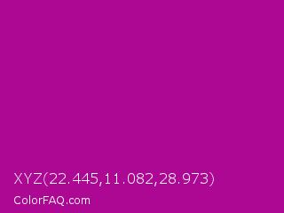 XYZ 22.445,11.082,28.973 Color is a normal magenta color and the nearest color is Violet Eggplant #991199. Hex code #ac0894 and RGB value is rgb(172,8,148). In RGB color space, this color is composed of 67% red, 3% green, 58% blue, In CMYK color space, this color is composed of 0% cyan, 95% magenta, 14% yellow , 33% black , In HSL color space, this color has a hue angle of 309° , 91% saturation and 35% lightness.