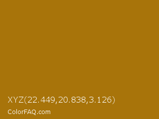 XYZ 22.449,20.838,3.126 Color is a normal orange color and the nearest color is Buttered Rum #a1750d. Hex code #a8740a and RGB value is rgb(168,116,10). In RGB color space, this color is composed of 66% red, 45% green, 4% blue, In CMYK color space, this color is composed of 0% cyan, 31% magenta, 94% yellow , 34% black , In HSL color space, this color has a hue angle of 40° , 89% saturation and 35% lightness.