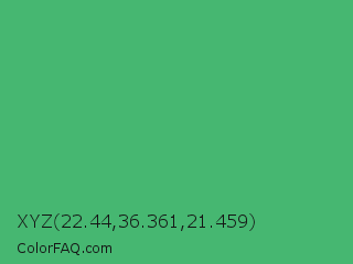 XYZ 22.44,36.361,21.459 Color is a normal green color and the nearest color is Medium Sea Green #3cb371. Hex code #46b771 and RGB value is rgb(70,183,113). In RGB color space, this color is composed of 27% red, 72% green, 44% blue, In CMYK color space, this color is composed of 62% cyan, 0% magenta, 38% yellow , 28% black , In HSL color space, this color has a hue angle of 143° , 45% saturation and 50% lightness.