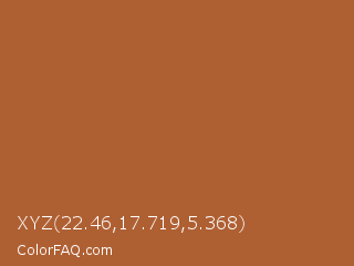 XYZ 22.46,17.719,5.368 Color is a normal orange color and the nearest color is Brown Rust #af593e. Hex code #af6033 and RGB value is rgb(175,96,51). In RGB color space, this color is composed of 69% red, 38% green, 20% blue, In CMYK color space, this color is composed of 0% cyan, 45% magenta, 71% yellow , 31% black , In HSL color space, this color has a hue angle of 22° , 55% saturation and 44% lightness.