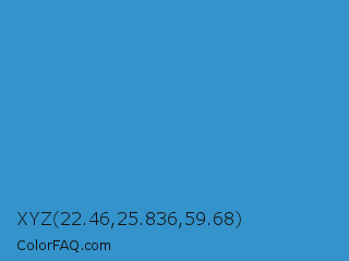 XYZ 22.46,25.836,59.68 Color is a normal blue color and the nearest color is Curious Blue #2596d1. Hex code #3393ca and RGB value is rgb(51,147,202). In RGB color space, this color is composed of 20% red, 58% green, 79% blue, In CMYK color space, this color is composed of 75% cyan, 27% magenta, 0% yellow , 21% black , In HSL color space, this color has a hue angle of 202° , 60% saturation and 50% lightness.