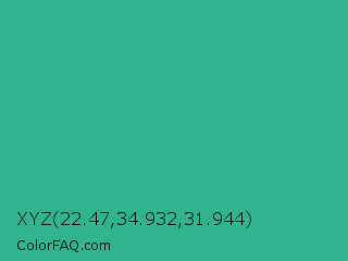 XYZ 22.47,34.932,31.944 Color is a normal cyan color and the nearest color is Mountain Meadow #30ba8f. Hex code #32b390 and RGB value is rgb(50,179,144). In RGB color space, this color is composed of 20% red, 70% green, 56% blue, In CMYK color space, this color is composed of 72% cyan, 0% magenta, 20% yellow , 30% black , In HSL color space, this color has a hue angle of 164° , 56% saturation and 45% lightness.