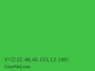 XYZ 22.48,40.103,12.186 Color is a normal green color and the nearest color is Lime Green #32cd32. Hex code #40c245 and RGB value is rgb(64,194,69). In RGB color space, this color is composed of 25% red, 76% green, 27% blue, In CMYK color space, this color is composed of 67% cyan, 0% magenta, 64% yellow , 24% black , In HSL color space, this color has a hue angle of 122° , 52% saturation and 51% lightness.