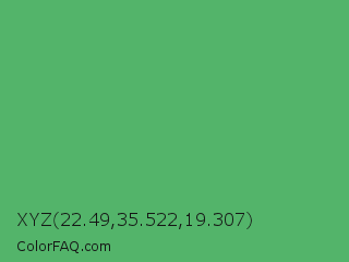 XYZ 22.49,35.522,19.307 Color is a normal green color and the nearest color is Fern #63b76c. Hex code #53b46a and RGB value is rgb(83,180,106). In RGB color space, this color is composed of 33% red, 71% green, 42% blue, In CMYK color space, this color is composed of 54% cyan, 0% magenta, 41% yellow , 29% black , In HSL color space, this color has a hue angle of 134° , 39% saturation and 52% lightness.