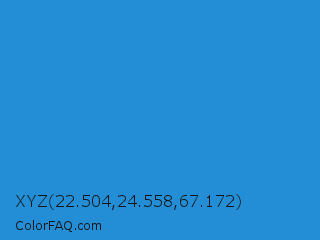 XYZ 22.504,24.558,67.172 Color is a normal blue color and the nearest color is Curious Blue #2596d1. Hex code #238ed6 and RGB value is rgb(35,142,214). In RGB color space, this color is composed of 14% red, 56% green, 84% blue, In CMYK color space, this color is composed of 84% cyan, 34% magenta, 0% yellow , 16% black , In HSL color space, this color has a hue angle of 204° , 72% saturation and 49% lightness.