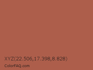 XYZ 22.506,17.398,8.828 Color is a normal red color and the nearest color is Giants Club #b05c52. Hex code #ad5e4b and RGB value is rgb(173,94,75). In RGB color space, this color is composed of 68% red, 37% green, 29% blue, In CMYK color space, this color is composed of 0% cyan, 46% magenta, 57% yellow , 32% black , In HSL color space, this color has a hue angle of 12° , 40% saturation and 49% lightness.