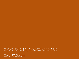 XYZ 22.511,16.305,2.219 Color is a normal orange color and the nearest color is Fiery Orange #b35213. Hex code #b65409 and RGB value is rgb(182,84,9). In RGB color space, this color is composed of 71% red, 33% green, 4% blue, In CMYK color space, this color is composed of 0% cyan, 54% magenta, 95% yellow , 29% black , In HSL color space, this color has a hue angle of 26° , 91% saturation and 37% lightness.