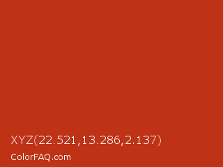 XYZ 22.521,13.286,2.137 Color is a normal red color and the nearest color is Thunderbird #c02b18. Hex code #be3216 and RGB value is rgb(190,50,22). In RGB color space, this color is composed of 75% red, 20% green, 9% blue, In CMYK color space, this color is composed of 0% cyan, 74% magenta, 88% yellow , 25% black , In HSL color space, this color has a hue angle of 10° , 79% saturation and 42% lightness.