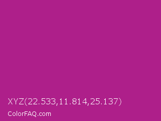 XYZ 22.533,11.814,25.137 Color is a normal magenta color and the nearest color is Fandango #b53389. Hex code #ae1f8a and RGB value is rgb(174,31,138). In RGB color space, this color is composed of 68% red, 12% green, 54% blue, In CMYK color space, this color is composed of 0% cyan, 82% magenta, 21% yellow , 32% black , In HSL color space, this color has a hue angle of 315° , 70% saturation and 40% lightness.