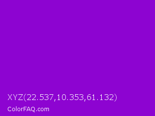 XYZ 22.537,10.353,61.132 Color is a normal purple color and the nearest color is French Violet #8806ce. Hex code #8d04d1 and RGB value is rgb(141,4,209). In RGB color space, this color is composed of 55% red, 2% green, 82% blue, In CMYK color space, this color is composed of 33% cyan, 98% magenta, 0% yellow , 18% black , In HSL color space, this color has a hue angle of 280° , 96% saturation and 42% lightness.