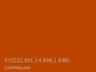 XYZ 22.561,14.699,1.648 Color is a normal orange color and the nearest color is Mahogany #c04000. Hex code #bb4400 and RGB value is rgb(187,68,0). In RGB color space, this color is composed of 73% red, 27% green, 0% blue, In CMYK color space, this color is composed of 0% cyan, 64% magenta, 100% yellow , 27% black , In HSL color space, this color has a hue angle of 22° , 100% saturation and 37% lightness.