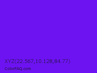 XYZ 22.567,10.128,84.77 Color is a normal violet color and the nearest color is Electric Indigo #6f00ff. Hex code #6d13f2 and RGB value is rgb(109,19,242). In RGB color space, this color is composed of 43% red, 7% green, 95% blue, In CMYK color space, this color is composed of 55% cyan, 92% magenta, 0% yellow , 5% black , In HSL color space, this color has a hue angle of 264° , 90% saturation and 51% lightness.