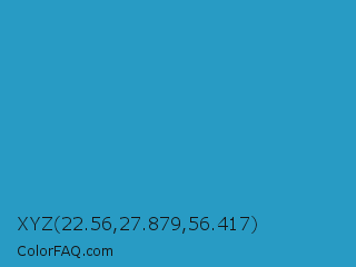 XYZ 22.56,27.879,56.417 Color is a normal blue color and the nearest color is Curious Blue #2596d1. Hex code #289bc4 and RGB value is rgb(40,155,196). In RGB color space, this color is composed of 16% red, 61% green, 77% blue, In CMYK color space, this color is composed of 80% cyan, 21% magenta, 0% yellow , 23% black , In HSL color space, this color has a hue angle of 196° , 66% saturation and 46% lightness.