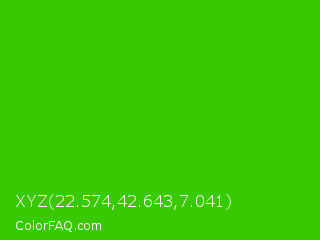 XYZ 22.574,42.643,7.041 Color is a normal green color and the nearest color is Harlequin Green #46cb18. Hex code #39c900 and RGB value is rgb(57,201,0). In RGB color space, this color is composed of 22% red, 79% green, 0% blue, In CMYK color space, this color is composed of 72% cyan, 0% magenta, 100% yellow , 21% black , In HSL color space, this color has a hue angle of 103° , 100% saturation and 39% lightness.
