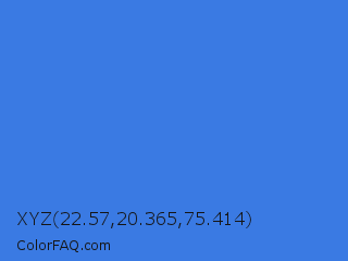 XYZ 22.57,20.365,75.414 Color is a normal blue color and the nearest color is Royal Blue #4169e1. Hex code #3a7ae3 and RGB value is rgb(58,122,227). In RGB color space, this color is composed of 23% red, 48% green, 89% blue, In CMYK color space, this color is composed of 74% cyan, 46% magenta, 0% yellow , 11% black , In HSL color space, this color has a hue angle of 217° , 75% saturation and 56% lightness.