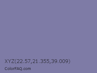 XYZ 22.57,21.355,39.009 Color is a normal indigo color and the nearest color is Shadow Blue #778ba5. Hex code #7e7ba6 and RGB value is rgb(126,123,166). In RGB color space, this color is composed of 49% red, 48% green, 65% blue, In CMYK color space, this color is composed of 24% cyan, 26% magenta, 0% yellow , 35% black , In HSL color space, this color has a hue angle of 244° , 19% saturation and 57% lightness.