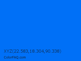XYZ 22.583,18.304,90.338 Color is a normal blue color and the nearest color is Brandeis Blue #0070ff. Hex code #0070f7 and RGB value is rgb(0,112,247). In RGB color space, this color is composed of 0% red, 44% green, 97% blue, In CMYK color space, this color is composed of 100% cyan, 55% magenta, 0% yellow , 3% black , In HSL color space, this color has a hue angle of 213° , 100% saturation and 48% lightness.