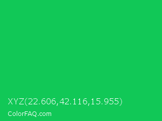XYZ 22.606,42.116,15.955 Color is a normal green color and the nearest color is Malachite #0bda51. Hex code #11c857 and RGB value is rgb(17,200,87). In RGB color space, this color is composed of 7% red, 78% green, 34% blue, In CMYK color space, this color is composed of 92% cyan, 0% magenta, 57% yellow , 22% black , In HSL color space, this color has a hue angle of 143° , 84% saturation and 43% lightness.