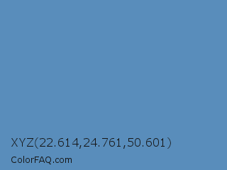 XYZ 22.614,24.761,50.601 Color is a normal blue color and the nearest color is Silver Lake Blue #5d89ba. Hex code #598dbb and RGB value is rgb(89,141,187). In RGB color space, this color is composed of 35% red, 55% green, 73% blue, In CMYK color space, this color is composed of 52% cyan, 25% magenta, 0% yellow , 27% black , In HSL color space, this color has a hue angle of 208° , 42% saturation and 54% lightness.