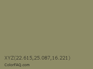 XYZ 22.615,25.087,16.221 Color is a normal yellow color and the nearest color is Avocado Pulp #888d65. Hex code #8d8b66 and RGB value is rgb(141,139,102). In RGB color space, this color is composed of 55% red, 55% green, 40% blue, In CMYK color space, this color is composed of 0% cyan, 1% magenta, 28% yellow , 45% black , In HSL color space, this color has a hue angle of 57° , 16% saturation and 48% lightness.